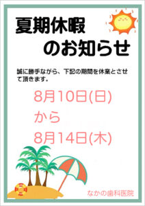 夏季休暇は8月10日(日)〜8月14日(木)までです。